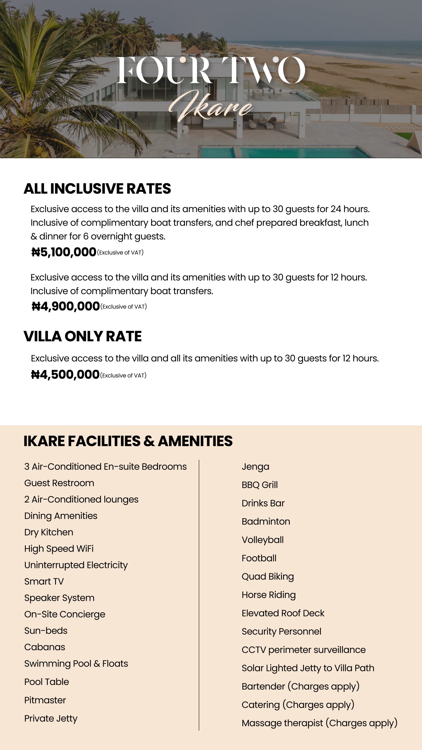 Four Two, Ikare is a picturesque 3-bed private resort-styled villa, surrounded by nature, sitting on 1800sqm on the Ikare beachfront along the Atlantic Ocean, 20 minutes away from Victoria Island, Lekki, and Ikoyi by boat. Touted by many as the best beach house in Lagos, Nigeria.